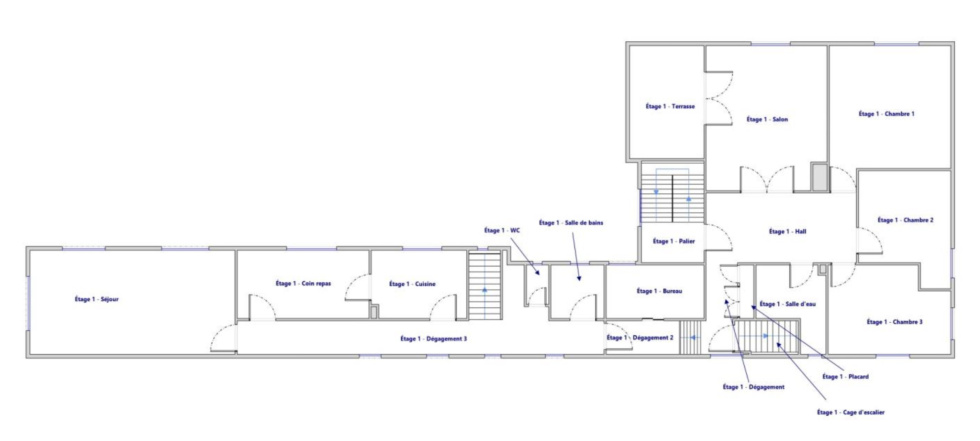 - 1 couloir équipé de rangements donnant accès au 1er étage du bâtiment 1 en demi-niveau bas ainsi qu’au 2ème étage (comble aménageable).