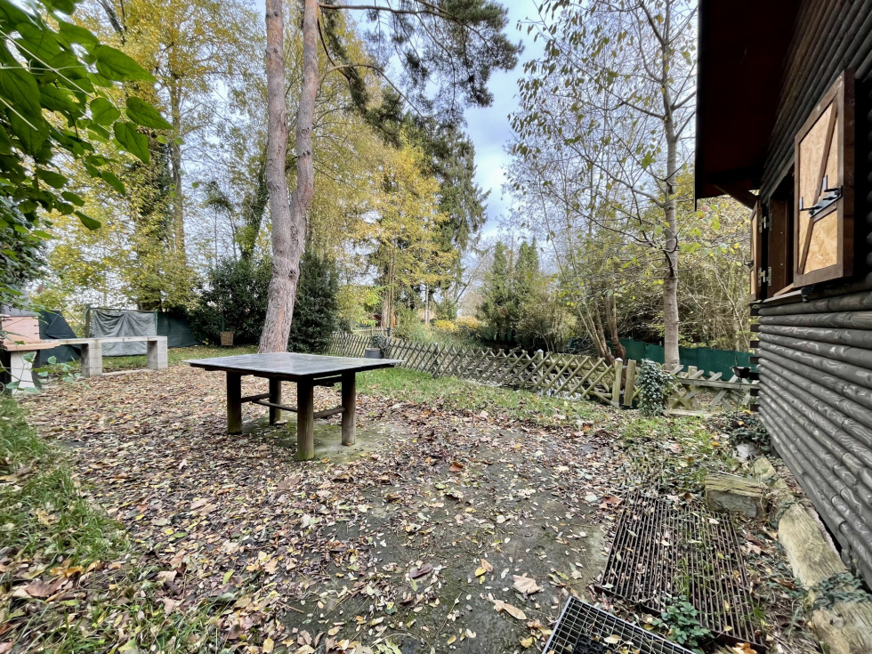 3%.COM – à PLOBSHEIM, Terrain de loisir de 15,74 ares arboré équipé d’un étang et d’un chalet en bois.