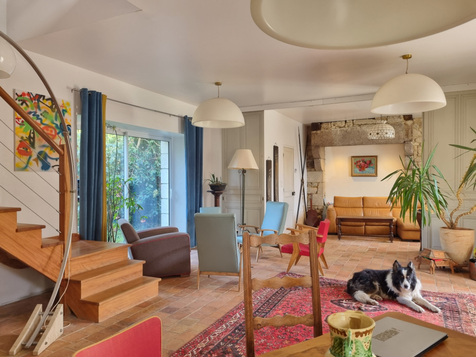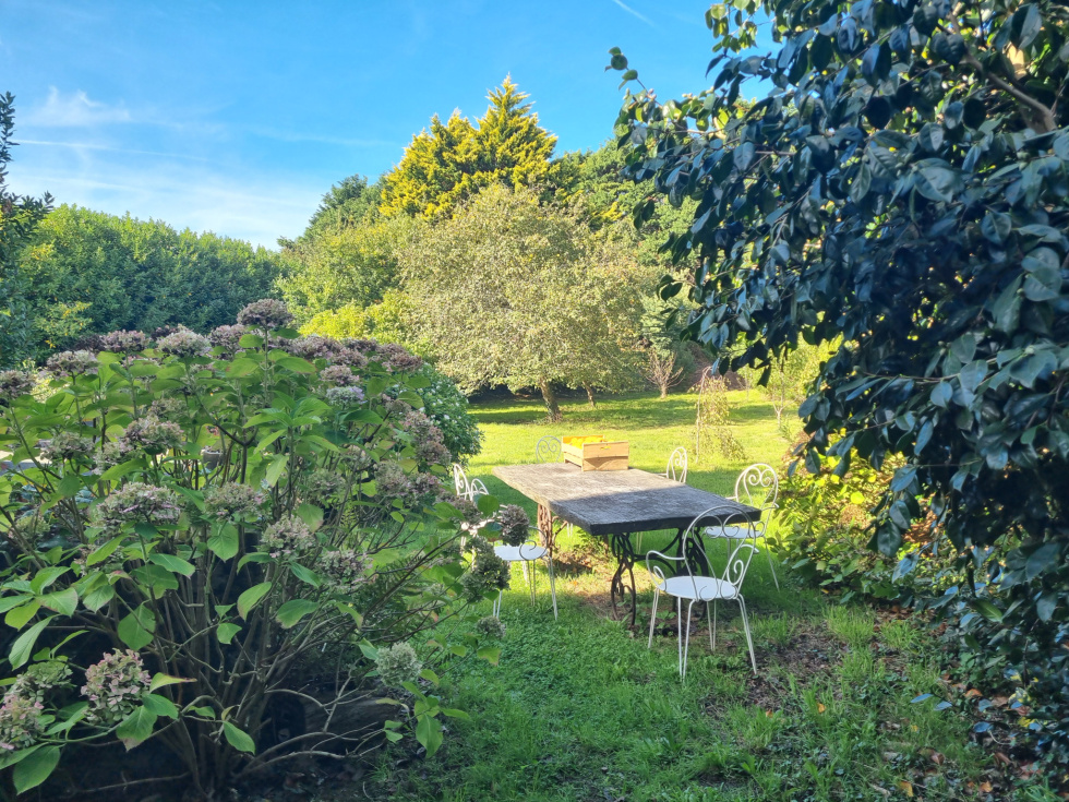 Celle-ci se compose au rez-de-chaussée d'une cuisine ouverte, un dégagement avec placard, un WC, un séjour donnant accès direct au vaste jardin et une suite parentale (actuellement utilisée en salon) avec sa cheminée d'époque.