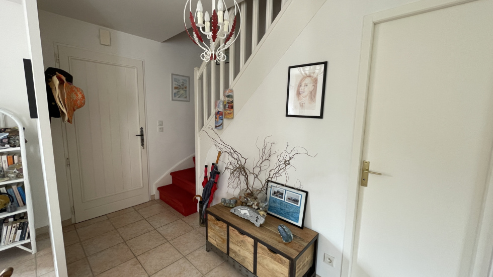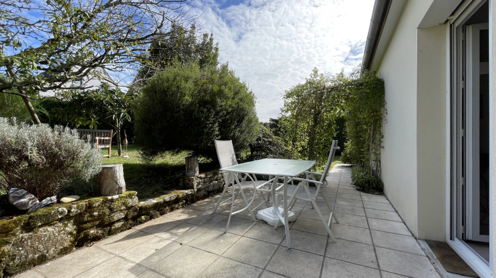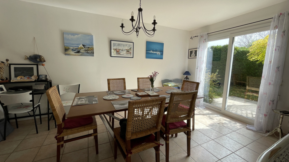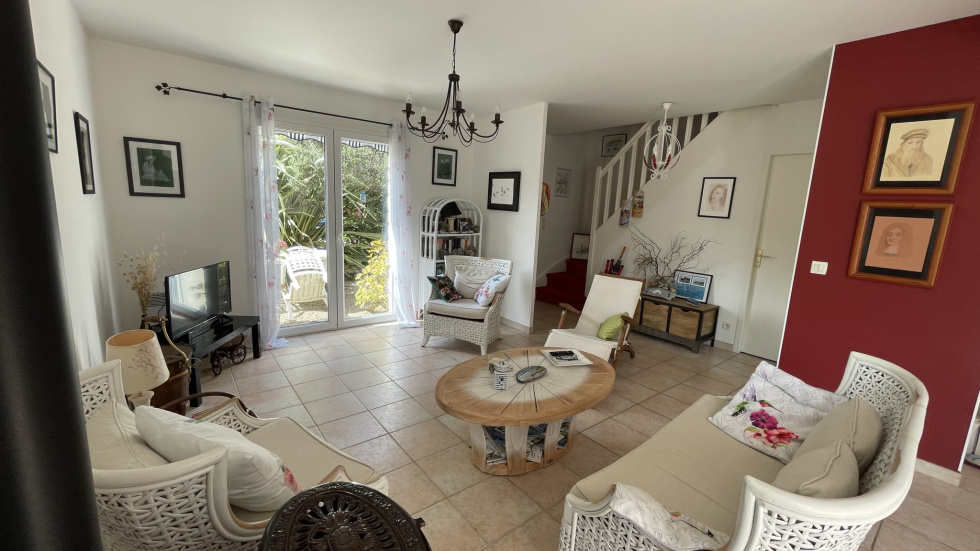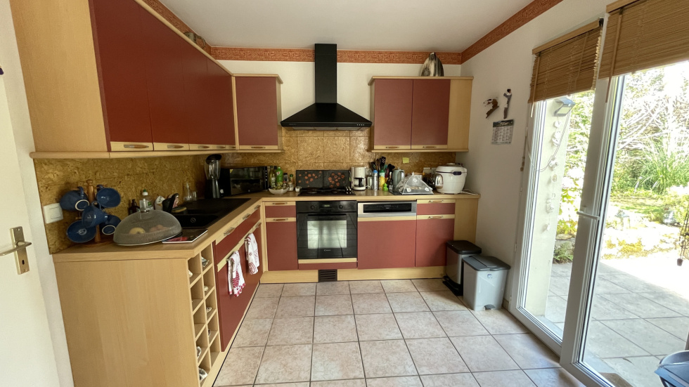 EXCLUSIVITE 3%.Com Immobilier Romain BRIFFAUT Idéalement située au cœur du bourg de Larmor-Baden, cette maison de 100m²(utile) bénéficie d’un emplacement privilégié : commerces, école et commodités accessibles à pied, tout en profitant du calme d’un lotissement de standing. Parfaitement entretenue par des propriétaires soigneux, elle séduit dès l’entrée avec ses rangements fonctionnels et son ambiance chaleureuse. La pièce de vie, baignée de lumière, s’organise autour d’un poêle à bois parfait pour votre confort et la convivialité. Elle s’ouvre sur trois terrasses idéalement orientées, accessibles depuis le salon, la salle à manger et la cuisine, pour profiter pleinement de chaque moment de la journée. La chambre de plain-pied, avec sa salle d’eau attenante, offre un confort appréciable. L’étage propose trois chambres spacieuses et lumineuses ainsi qu’une salle de bains. Implantée sur une belle parcelle de 719 m², entièrement close, arborée et paysagée, la propriété invite à la détente. Un garage, un grand grenier et un abri de jardin complètent l’ensemble. Le terrain, piscinable et permettant une extension, offre de belles possibilités d’évolution. Une maison en parfait état, prête à accueillir de nouveaux propriétaires, dans un cadre recherché idéal en résidence principale comme en résidence secondaire. Prix de vente frais d’agence inclus : 597 400 € (dont 3 % d’honoraires à la charge de l’acquéreur)Prix hors honoraires : 580 000 € Contactez Romain BRIFFAUT au 0624912471-RSAC de Vannes 820039162-Agent Commercial en immobilier