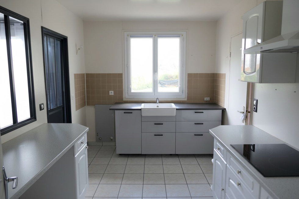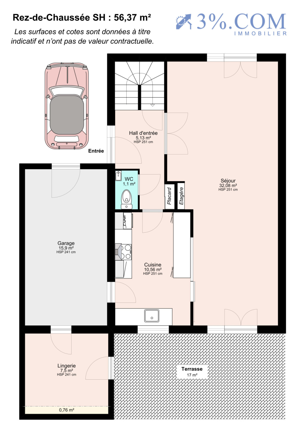 ***RDC : Hall d’entrée _ Séjour (32 m²) _ Cuisine aménagée & équipée _ WC _ Lingerie _ Garage _ Terrasse (17 m²)