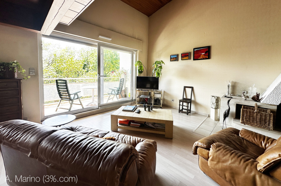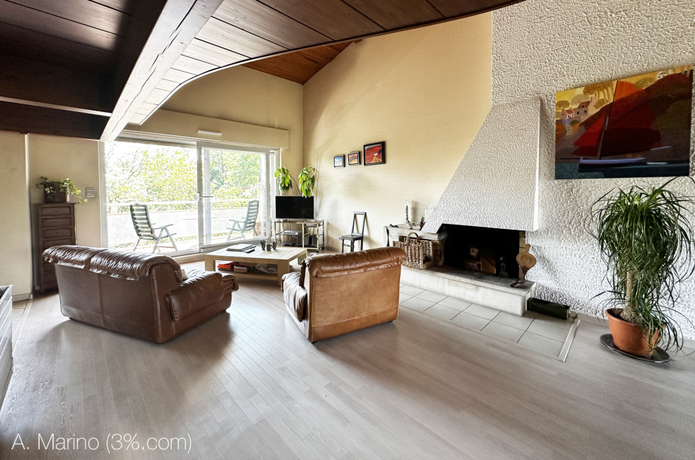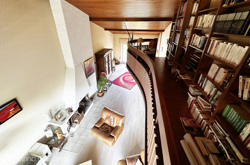 -- 1 salon toit cathédrale de 50 m², traversant avec mezzanine, cheminée et accès aux 2 balcons.