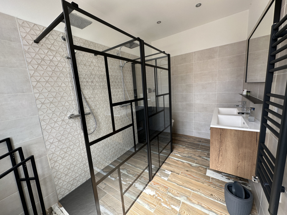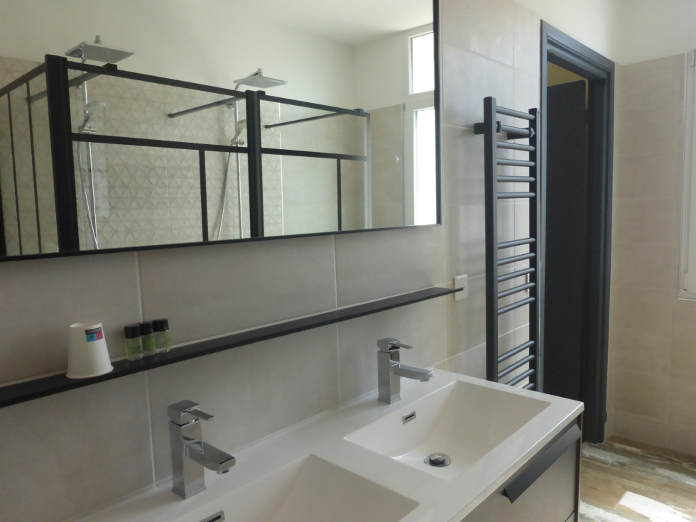 A l’étage de cette partie habitable se trouve un palier de 21 m² distribuant à 5 chambres. On y trouve deux chambres de 8,87 et 8,50 m² avec une salle d’eau privative et wc, puis une chambre de 16 m² avec sa salle de bain privative, suivi d’une chambre de 9,60 m² avec sa salle d’eau et wc et pour finir un dernier espace avec une pièce donnant accès à une chambre de 14,30 m² sa salle d’eau privative avec wc et sa terrasse de 15 m².