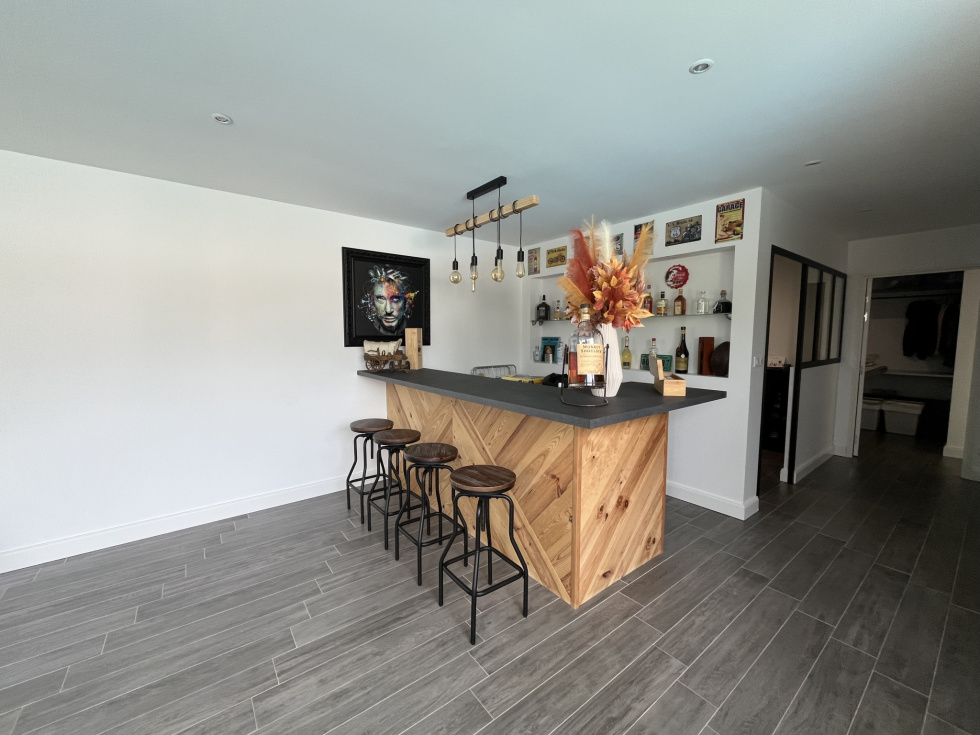 Rare à la vente !! Maison contemporaine de 185 m² habitable de plain-pied avec piscine de 8 x 4 chauffée, sur un terrain clos de 2400 m². Hall d'entrée de 8.5 m². Séjour-salon-cuisine aménagée et équipée (four, plaque, hotte, cave à vin, micro-ondes, lave vaisselle et frigo américain) de 60 m² traversant (lumineux) sur terrasse couverte (sol en travertin). Une suite de 33 m² (espace nuit, dressing aménagé et salle de bain, baignoire, douche et meuble double vasque). Deux chambres de 13 m². Une salle d'eau. Un espace réception/salle de sport/salle de jeux de 36 m² (chambre et salle de bain possible). Un bureau de 6 m² Un buanderie. Un garage de 25 m² avec terrasse couverte, cuisine d'été et wc. Chauffage par le sol. Taxe foncière de 2458 euros. Construction de 2019. Christophe Oumalou RSAC 520 302 852 000 27