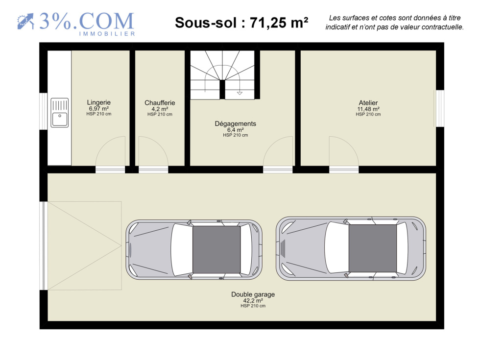 ***SOUS-SOL : Dégagement _ Double garage (porte motorisée) _ Atelier _ Lingerie _ chaufferie