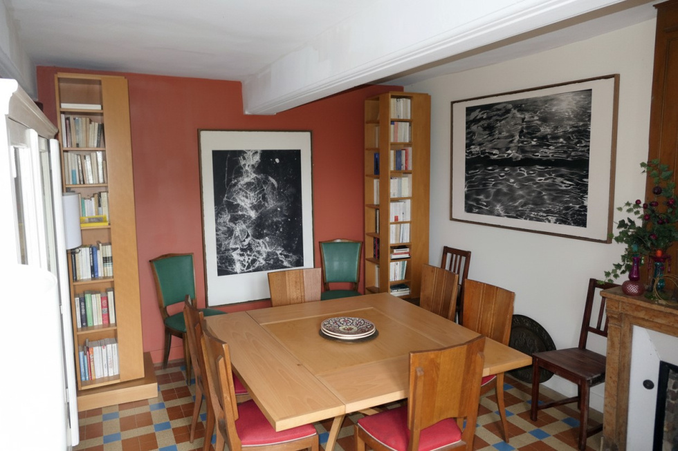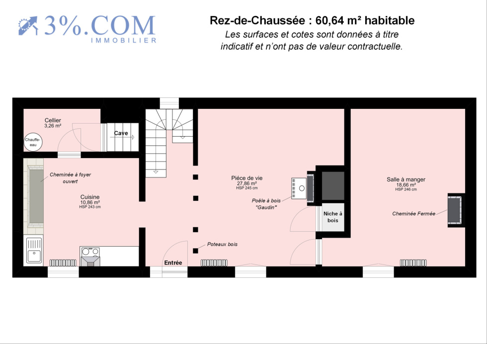 ***RDC : Hall d’entrée _ Cuisine équipée et cellier _ Pièce de vie (28 m²) avec cheminée à foyer fermé _ Salle à manger (18 m²)