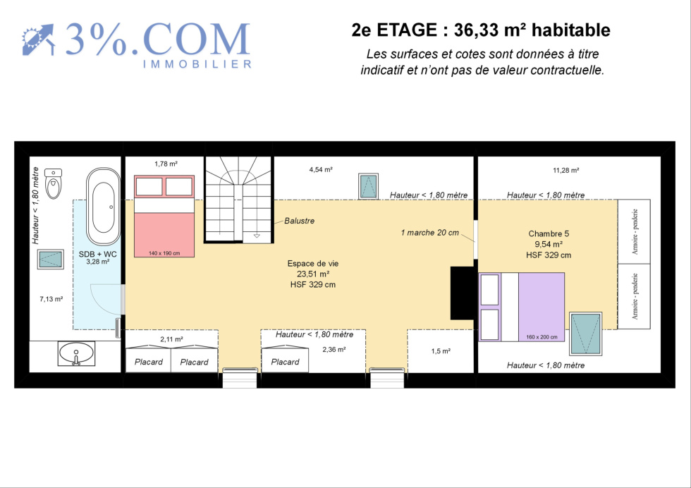***2e ETAGE : Grand espace de vie (23 m²) _ 1 chambre _ 1 SDB avec WC