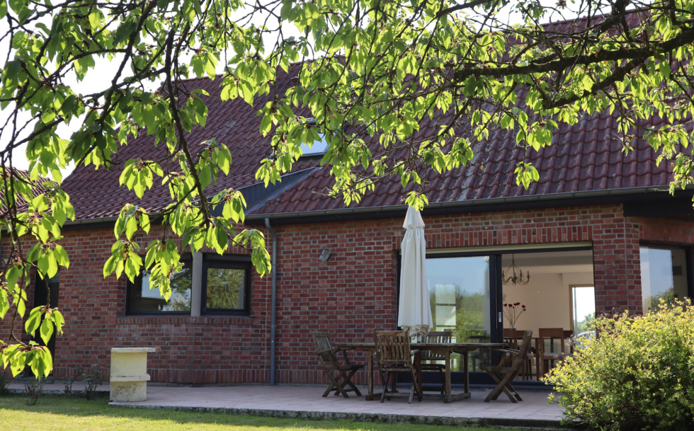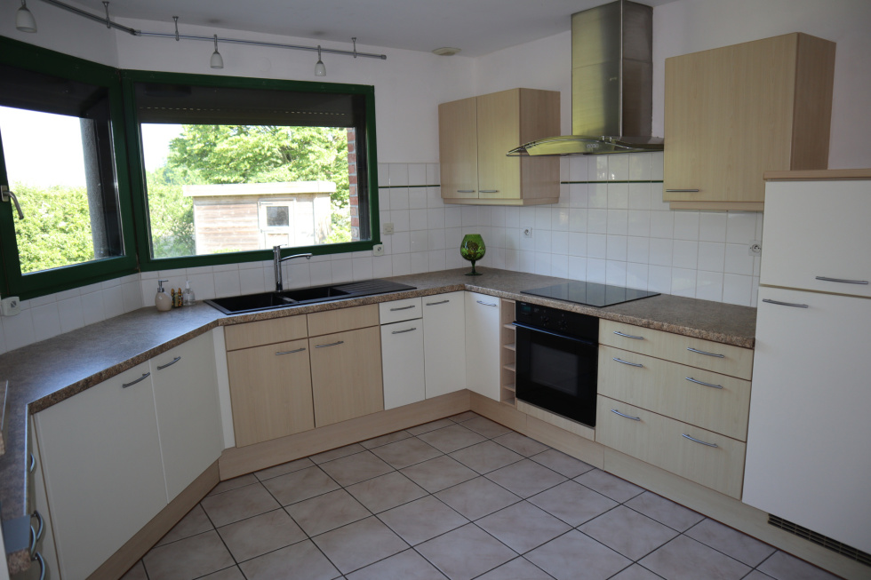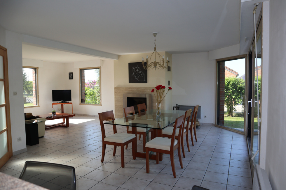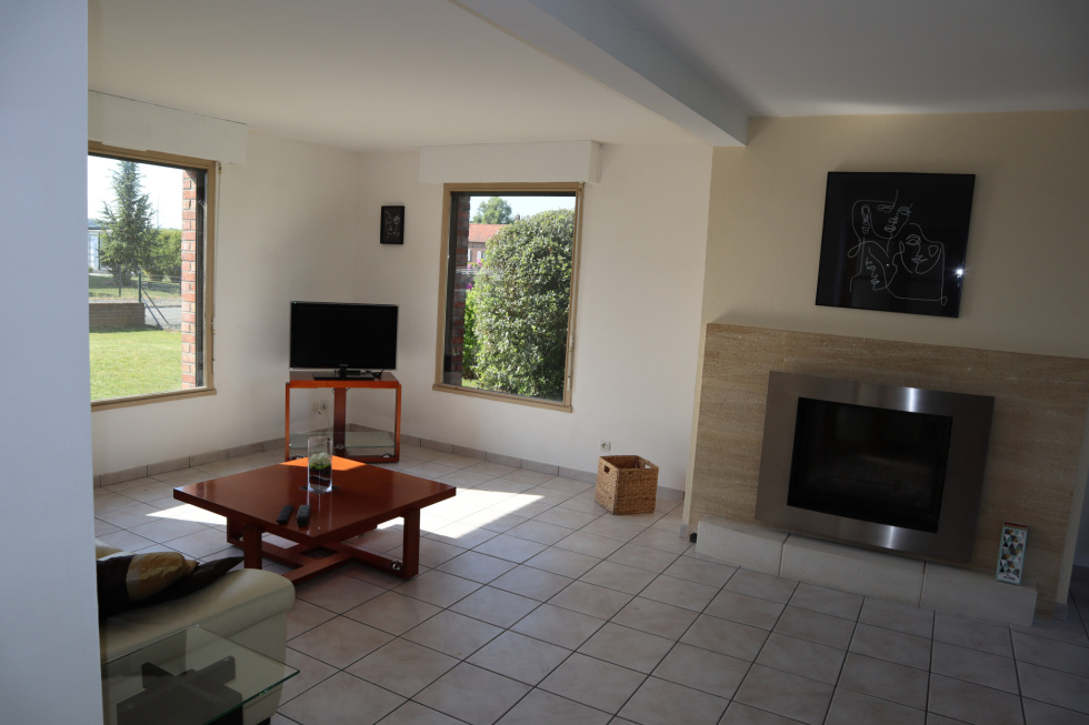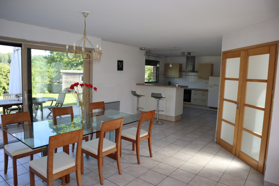 Au rez de chaussée: 1 entrée indépendante - 1 grande pièce de vie d'environ 41m² avec cheminée feu de bois - 1 cuisine toute équipée ouverte (14,62m²) sur la pièce de vie - 1 cellier avec accès au jardin - 1 double garage - 1 WC dans le hall d'entrée.