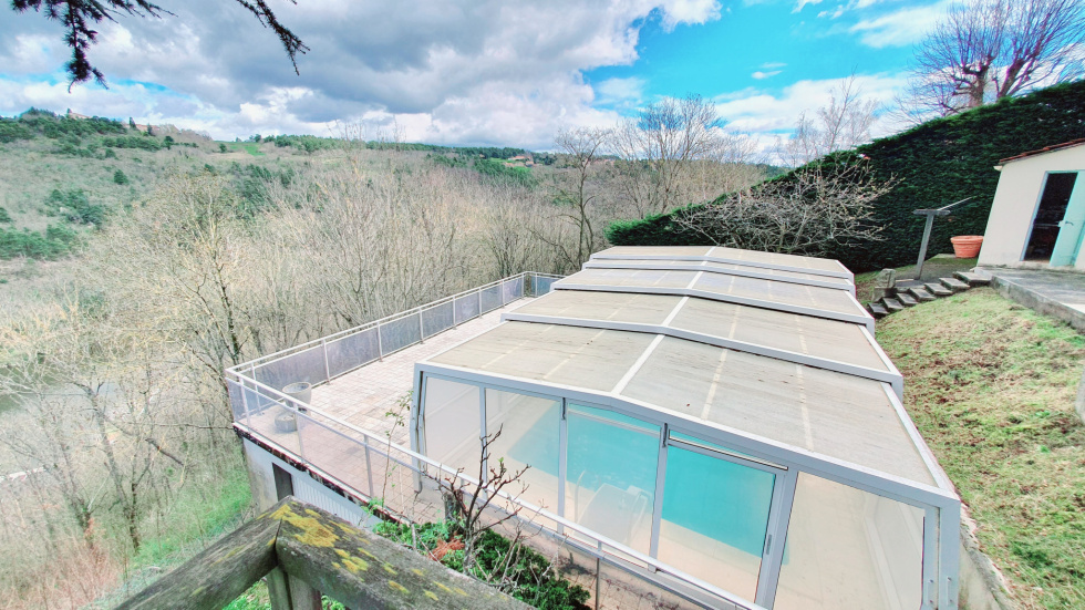 Un terrain de 1244m2 équipé d'une jolie piscine Desjoyaux 7x4 doté d'un abri piscine, nichée dans une des grandes terrasses avec vue sur le lac .