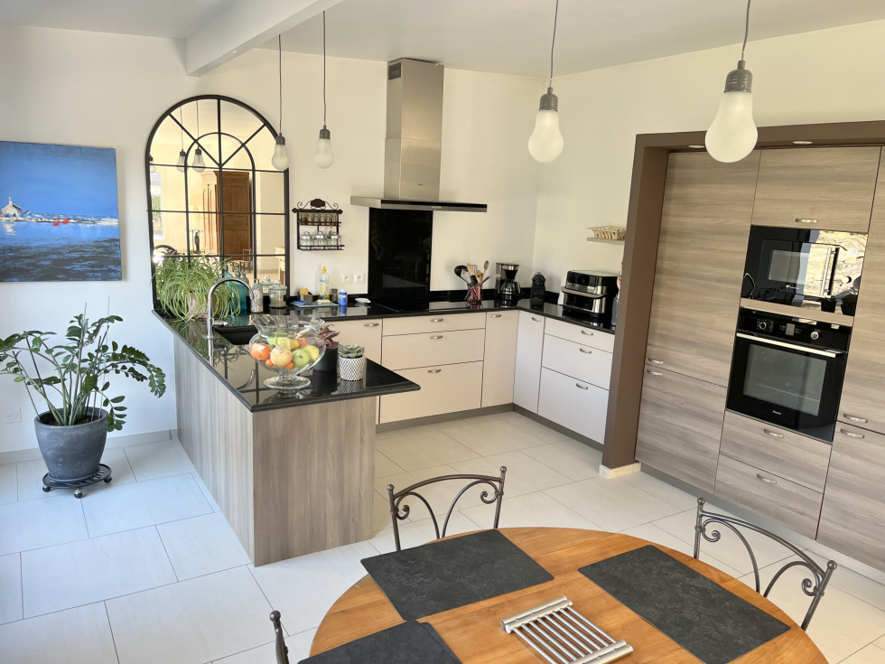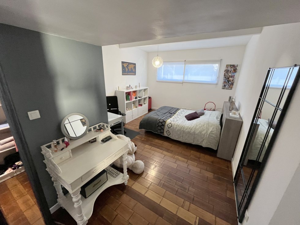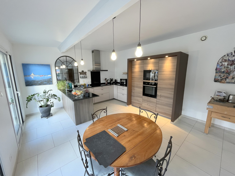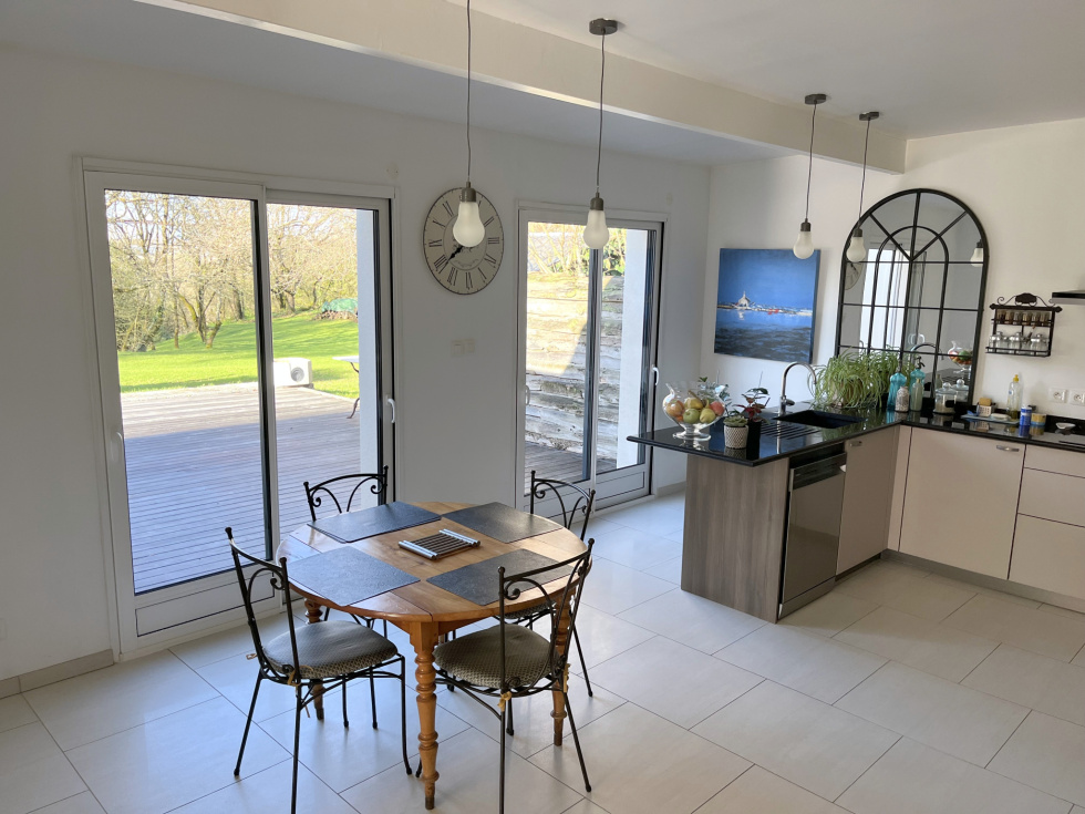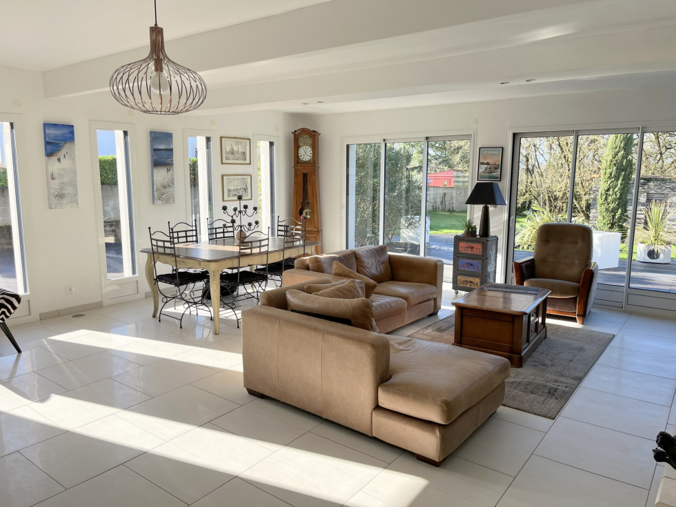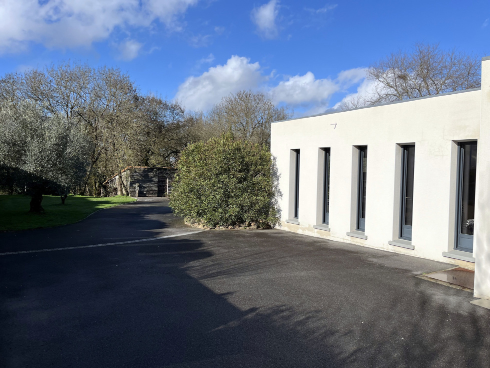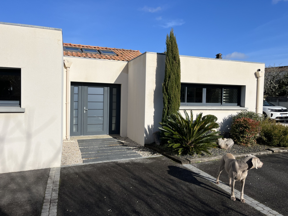 MAISON de Standing 233 m² en surface utile de 6 Pièces sur TERRAIN 5 844 m² en Centre ville BOUGUENAIS Stéphane GODARD de 3%.COM Immobilier, vous propose cette Maison Contemporaine de Standing de Plain-pied de 2010 avec une partie complémentaire en étage de 29 m². Cette magnifique Résidence d'une surface d'environ 233 m² de surface utile, évoluant sur un Terrain arboré de 5 844 m², vous offrira Paix et Sérénité. . Située au calme dans un quartier résidentiel de Bouguenais, à 3 minutes en voiture de Trentemoult et du pôle commercial de Rezé, comprenant les grandes enseignes comme E.Leclerc, Leroy Merlin, Boulanger etc … vous permettant d'avoir accès à toutes les commodités commerciales, vous serez à 2 minutes du Pont de Cheviré entrée directe du Périphérique Nantais. Mais aussi à 400 mètres de la station Bus « Pierre » ( Ligne TE1 ) et à 500 mètres de la station Bus « Châtelier » ( Ligne 36 ) . Cette splendide demeure vous propose : Une Entrée de 23 m² distribuant un Bureau de 13 m² avec placard aménagé, une première suite de plus de 22 m² comprenant chambre, salle d'eau et dressing, et une deuxième suite de plus de 28 m² comprenant chambre, salle d'eau, WC suspendu et dressing, un 2è WC indépendant, un Salon particulier avec une salle d'eau permettant de le transformer en une 3è chambre si besoin, une Pièce de vie de 71 m² avec cheminée insert et une cuisine moderne aménagée et équipée, le tout équipé d'une multitude de baies coulissantes s'ouvrant sur une grande Terrasse en bois avec une excellente exposition Sud-Ouest, avec vue sur un gigantesque terrain arboré et classé de plus de 5 000 m², offrant un dépaysement total, de verdure et de nature, au cœur d'un site citadin nantais. Un escalier nous amène à une quatrième suite de plus de 28 m² comprenant chambre, salle d'eau et dressing, un coin détente ( salle de jeux-bibliothèque ) et un coin débarras. . Une arrière-cuisine, un cellier avec évier, un Carport et plusieurs places de parking, et plusieurs annexes sur le terrain viendront compléter cette magnique Résidence. Nous noterons de très belles prestations, avec notamment plancher chauffant Gaz de ville, volets roulants centralisés, portail électrique, interphone et visiophone etc ... . Belle opportunité à saisir. PRIX de 628 300 € HAI ( Honoraire Agence Inclus ) . Une étude de financement GRATUITE peut vous être fournie par notre spécialiste de prêt en immobilier. Contactez Stéphane GODARD au 06 81 51 60 18 du Lundi au Samedi de 9h00 à 20h00 - Agent Commercial en Immobilier - R.S.A.C. Nantes 788 615 045 - 3%.COM Immobilier - Réseau national à honoraires réduits de 3%