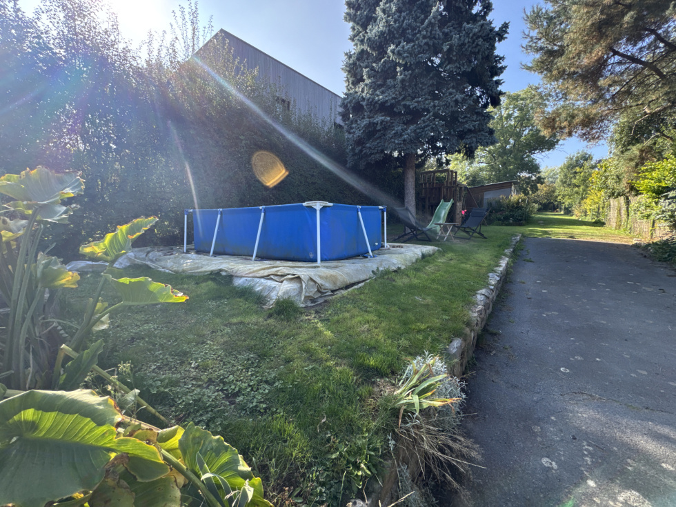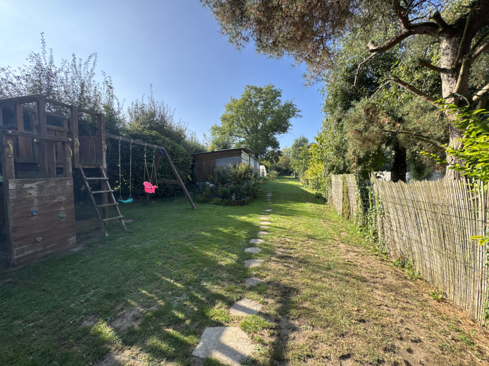 Jardin plein sud d’environ 700 m², aménagé avec pelouse, terrasse et espace potager
