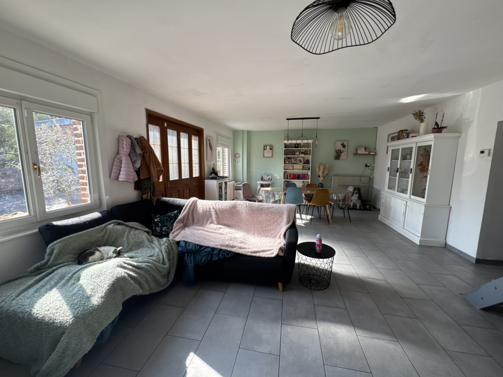 Grande pièce de vie lumineuse de 40 m² avec poêle à bois