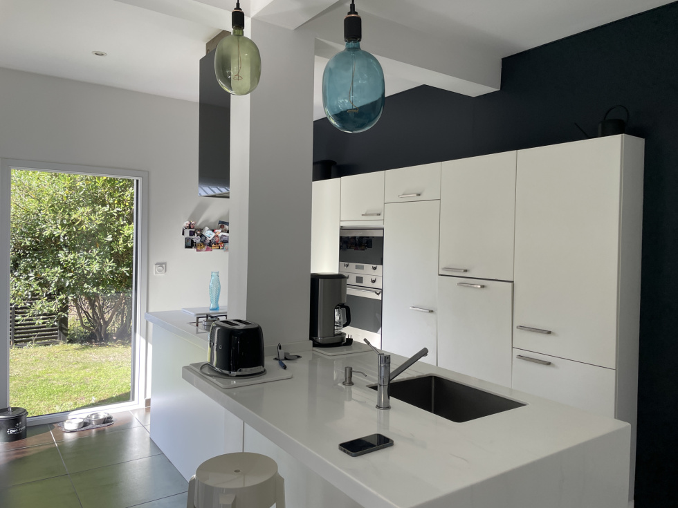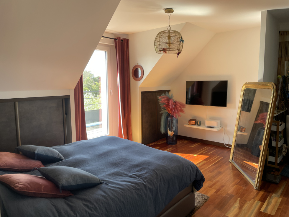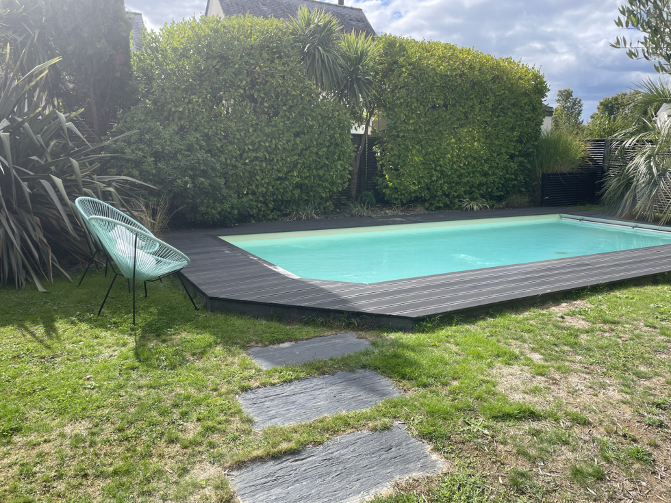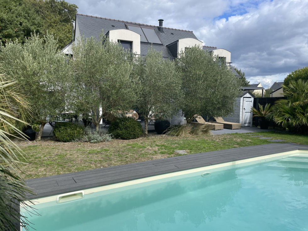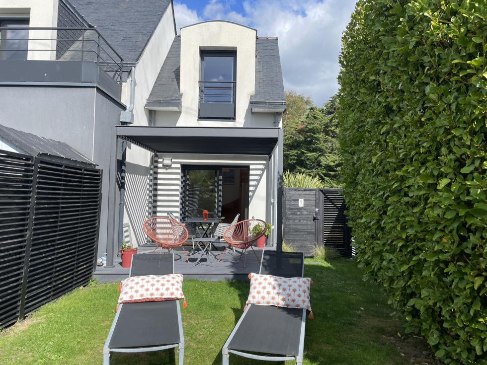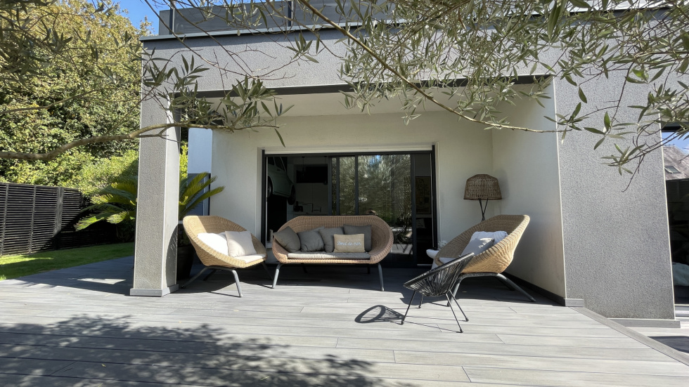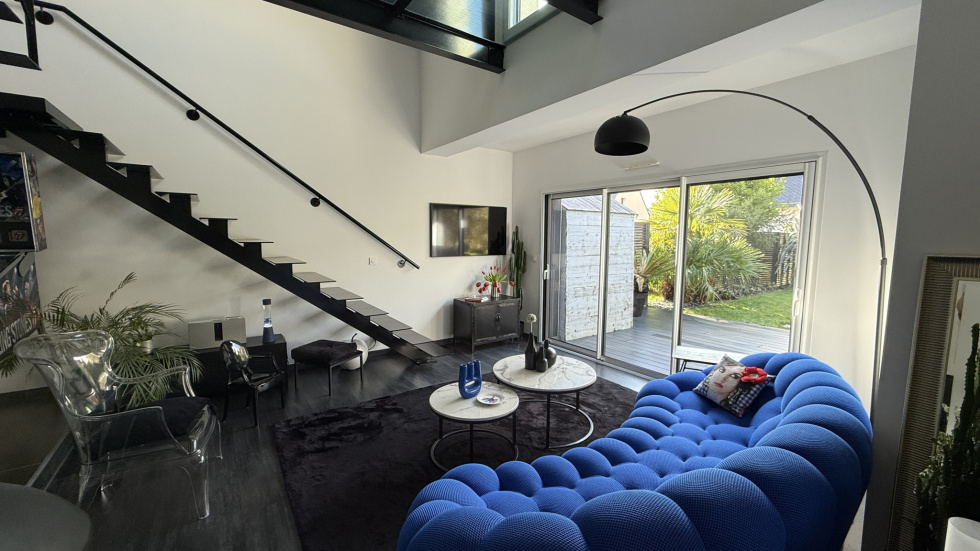3%.Com Immobilier Romain BRIFFAUT Situation idéale pour cette contemporaine récente à 200 mètres de la plage, des sentiers côtiers, le bourg de Larmor Baden à 700m et ses commodités La maison se compose d'une entrée donnant sur un grand séjour, salon avec poêle à bois suspendu, belle hauteur sous plafond, beaux volumes et lumineux. Cuisine équipée et ouverte sur la pièce principale. L'ensemble bénéficie de finitions soignées, équipements et de matériaux de qualités. Arrière cuisine, et un accès au garage. Deux belles terrasses avec vue sur la piscine et le jacuzzi. Toujours au rez-de-chaussée, un T2 avec cuisine, salle d'eau, pièce principale, donnant sur la terrasse, avec un accès indépendant. A l'étage du T2, une chambre avec vue sur l'eau. Idéal pour de la location.(Possibilité d'intégrer le T2 pour une suite parentale au rez de chaussée, à l'étage, la chambre communique avec la mezzanine) A l'étage, une superbe passerelle pour accéder à une grande terrasse type solarium, pour profiter de la vue et de l'exposition ! Une mezzanine, coin bureau, une grande chambre type dortoir avec une balnéo. Une suite parentale, grande chambre, une salle d'eau, dressing et un accès terrasse. A l'extérieur, superbe jardin de 632m², arboré, clos, paysagé, terrasse de 100 m², une piscine chauffée de 8*3.5 et un jacuzzi. Maison peu énergivore, panneaux solaires pour le ballon d'eau chaude. Plusieurs stationnements, il reste des possibilités sur le terrain pour de futurs aménagements. Prix de vente frais d'agence inclus de 1 089 000 € dont 3% de frais d'agence à la charge de l'acquéreur Prix de vente hors frais d'agence de 1 058 000 € Contactez Romain BRIFFAUT au 0624912471 RSAC de Vannes 820 039 162-Agent Commercial en Immobilier.