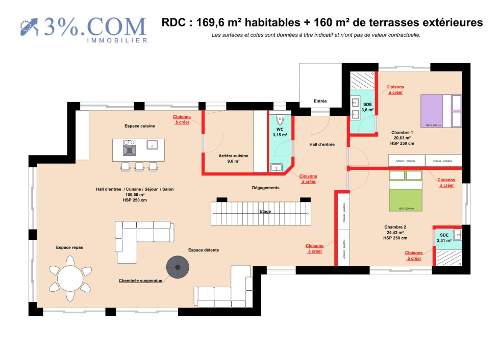 3%.COM, vous présente, cette maison de 2018 inachevée, vous séduira par son potentiel 300 m² hab. _ 9 pièces principales _ 6 chambres _ terrain de 1900 m² _ Séjour orienté Sud ***RDC : Hall d’entrée _ Espace à vivre (106 m²) comprenant : Cuisine / Séjour / Salle / Salon _ Arrière-cuisine _ 2 Chambres avec SDE _ WC _ Terrasses (160 m²) ***ETAGE : Dégagement _ Suite parentale (39 m²) avec SDB et WC indépendant _ 3 Chambres avec SDE à définir _ WC à finaliser ***SOUS-SOL (183 m²) : Triple Garage _ Espace stockage (46 m²) _ Pièce à définir (53 m²) +++Les points forts : Construction selon la norme RT2012 _ Menuiseries en PVC double vitrage avec volets intégrées _ 8 PAC air / air de 6KWh chacune _ Cheminée suspendue Focus (21 KWh) +++Les travaux à finaliser selon un budget estimer à 200 000 Euros (+/-10%) par un Maître d’œuvre · Finalisation du poste électricité Finalisation du poste chauffage 8 PAC air / air (déjà installées) Finalisation de la ventilation RDC & Etage (déjà installée) Finalisation de l’isolation du RDC avec membrane d’étanchéité Modification ou création de doubles cloisons avec menuiseries Finalisation ou modification des sanitaires Finalisation ou modification d’une cuisine et de son arrière-cuisine Finalisation de l’escalier principale RDC & Etage (matériaux de finition présents) Mise en peinture des murs et plafonds Finalisation des sols ***Proximités : Tous commerces (4 min) _ La plage de Berneval-le-Grand (9 min) Centrale EDF Penly (8 min) _ Dieppe (13 min) _ Le Tréport / Mers-les-Bains (24 min) *** PRIX DE VENTE HONORAIRES D'AGENCE INCLUS : 463 500,00 € HAI *** (Honoraires d'agence (3 %) à la charge de l’acquéreur, inclus dans le prix indiqué ci-dessus) Pour tout renseignement (ou pour toute visite, etc.) contacter : Pascal SCRIBE - Tél. 06.56.69.69.25 Agent Commercial en Immobilier - RCS Dieppe N°910 245 133 3%.COM IMMOBILIER, réseau national à honoraires réduits.