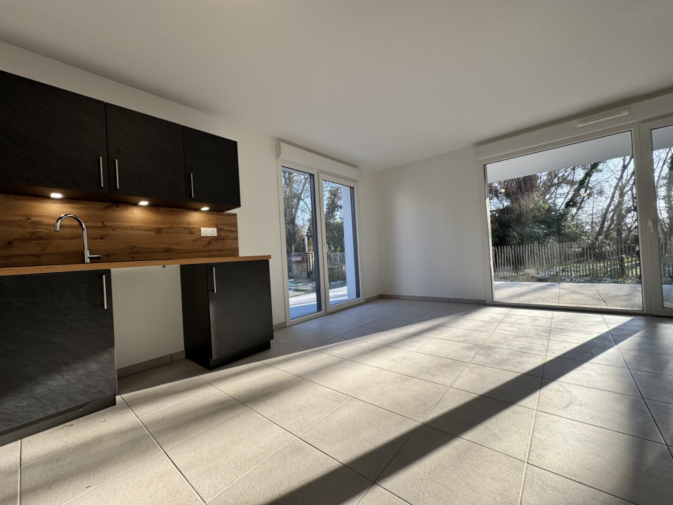 -- 1 espace salon/séjour/cuisine de 28 m² donnant sur la terrasse et son jardin privatif