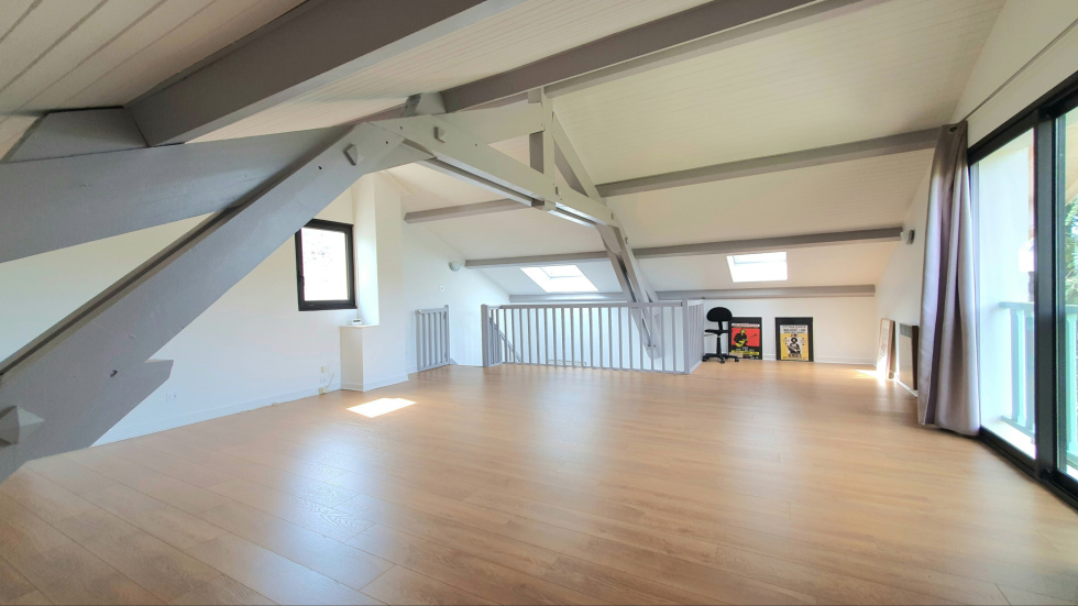 Au niveau +1 : Un salon de 53m2 cocooning avec poutres apparentes (possibilité de faire plusieurs chambres en plus si nécessaire à ce niveau )