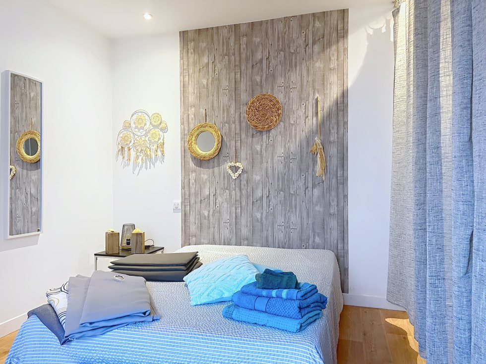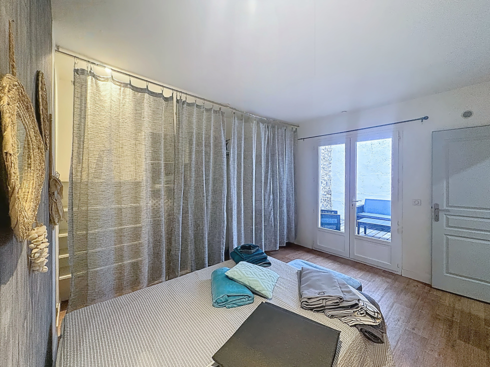 La grande chambre, tout comme le séjour, s’ouvre sur un véritable atout rare : un patio intimiste de 10,8 m², décoré de pierres apparentes et de plantes exotiques. Un espace privilégié, idéal pour se détendre en toute tranquillité ou imaginer l’installation d’un jacuzzi.