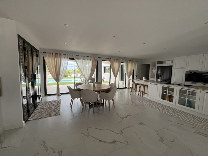 Rare à la vente !! Maison contemporaine de 185 m² habitable de plain-pied avec piscine de 8 x 4 chauffée, sur un terrain clos de 2400 m². Hall d'entrée de 8.5 m². Séjour-salon-cuisine aménagée et...